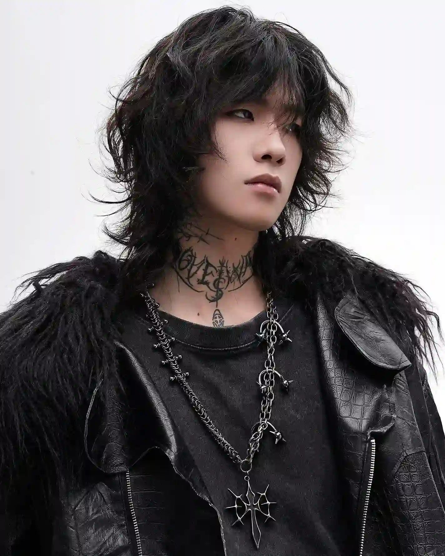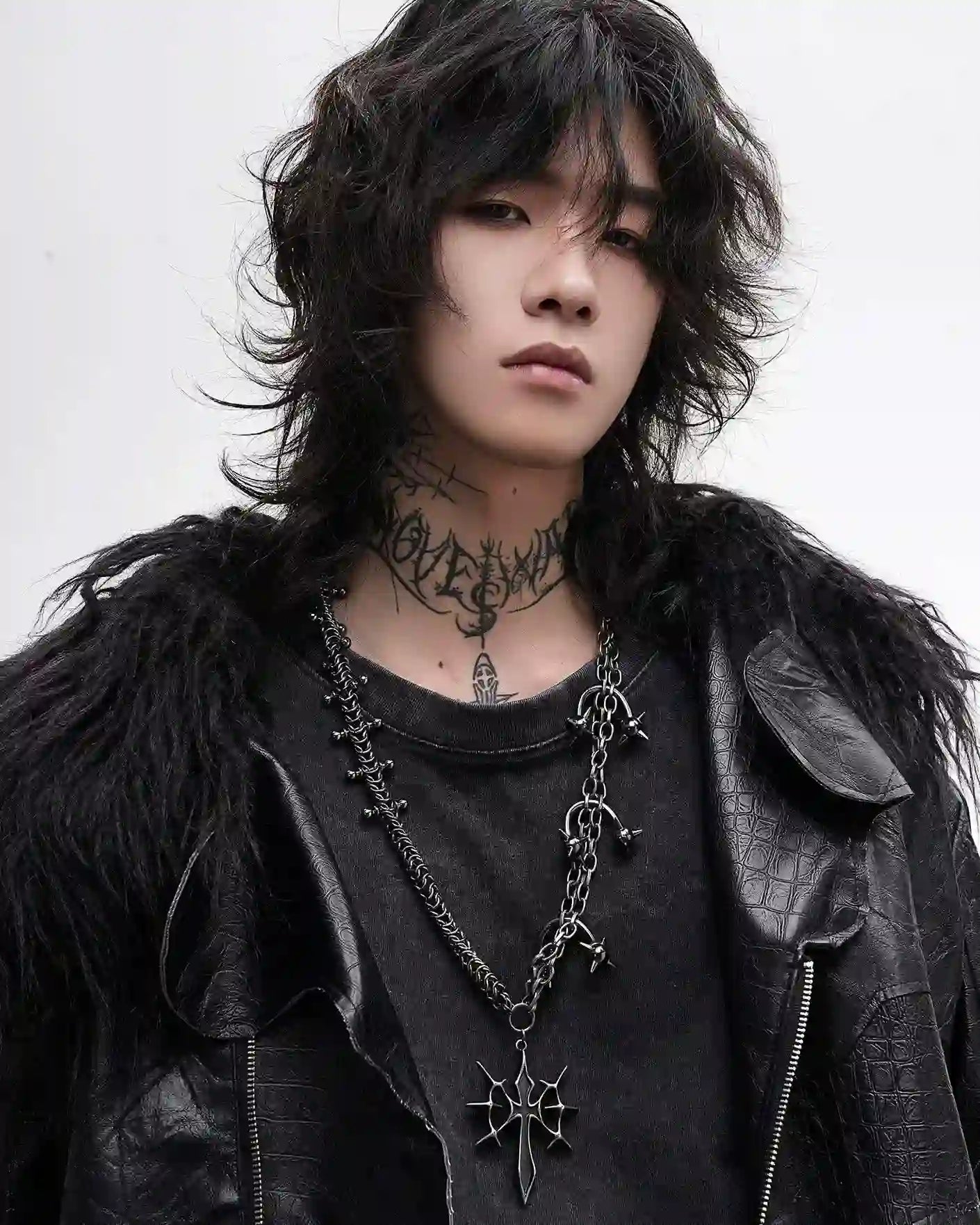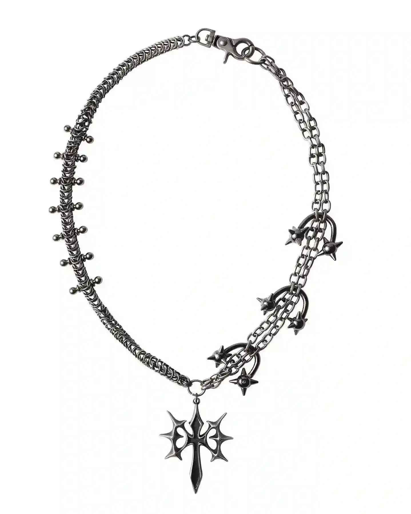 Dual-layered chains and a pointed crucifix—armor for the darkly bold.