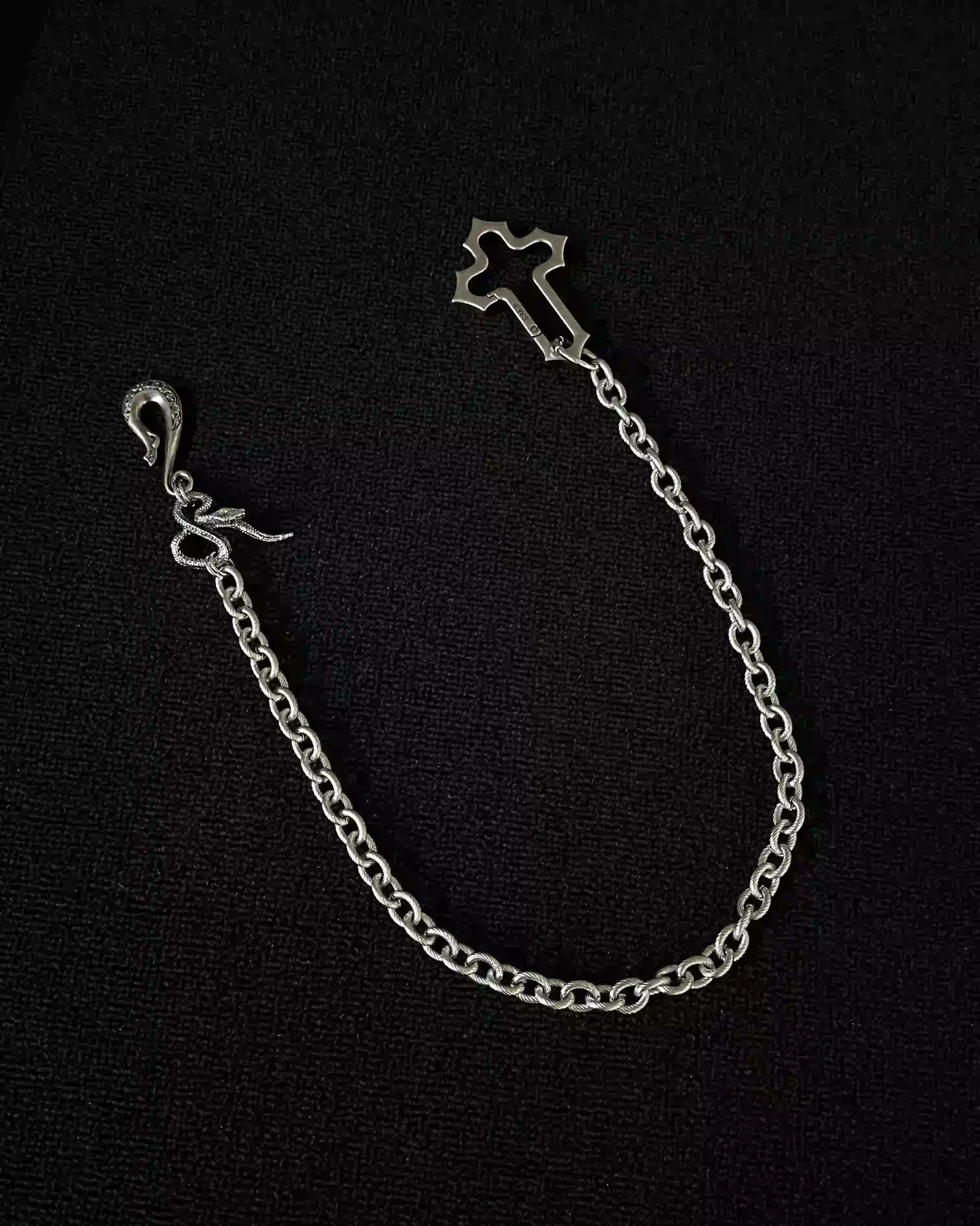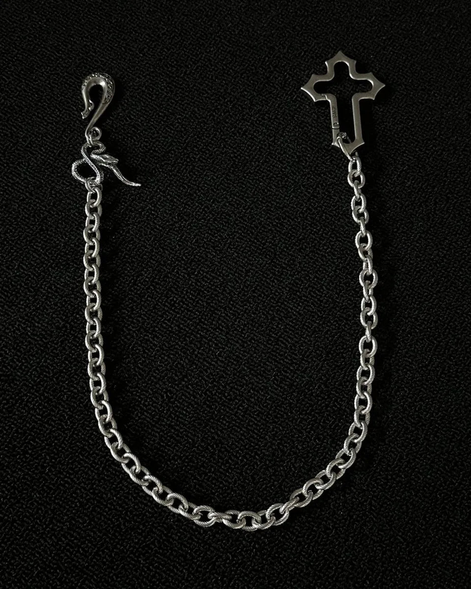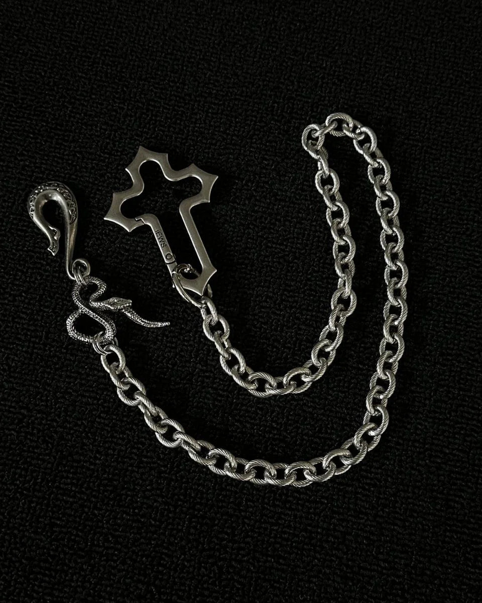 • This pants chain features a silver-tone cross and snake-shaped hook, capturing the essence of gothic aesthetics.