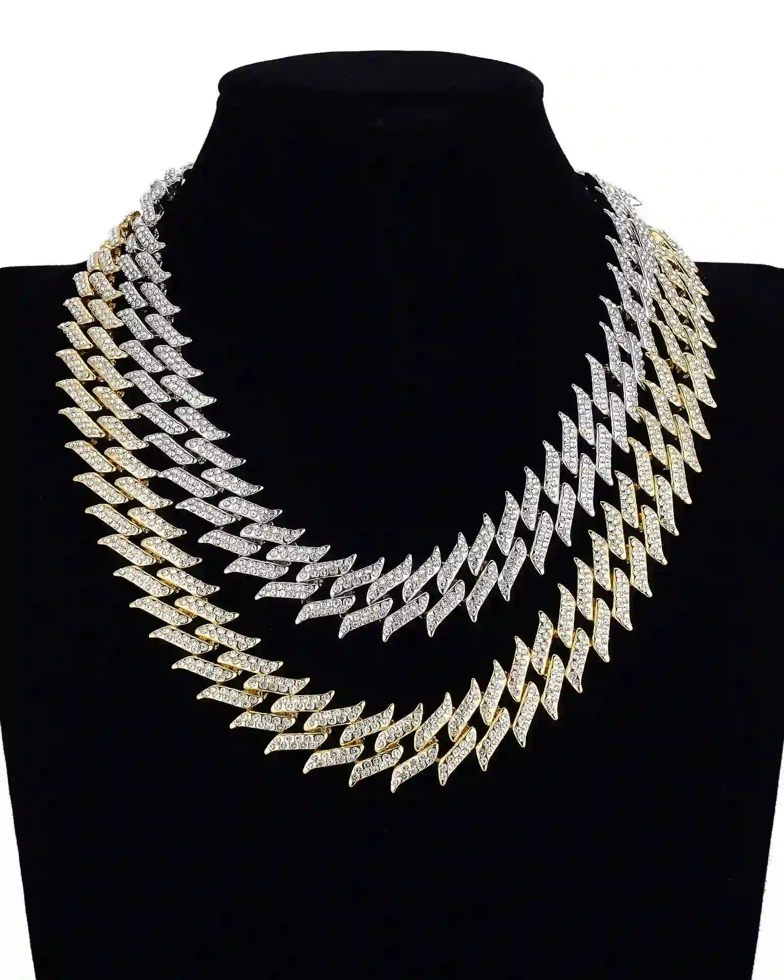 "Lightning-shaped links, bold and striking. Iced with brilliant stones and golden shine, this chain radiates street power and luxury."