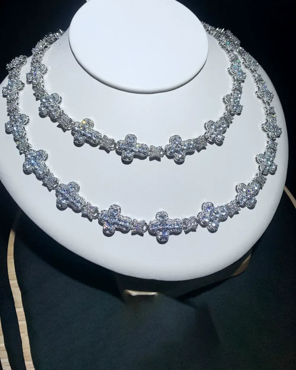 A winged cross pendant that balances faith and edge—finished with an iced-out shine that pops in photos and under streetlights. Wear it solo or stack it with a tennis/rope chain for a louder look.