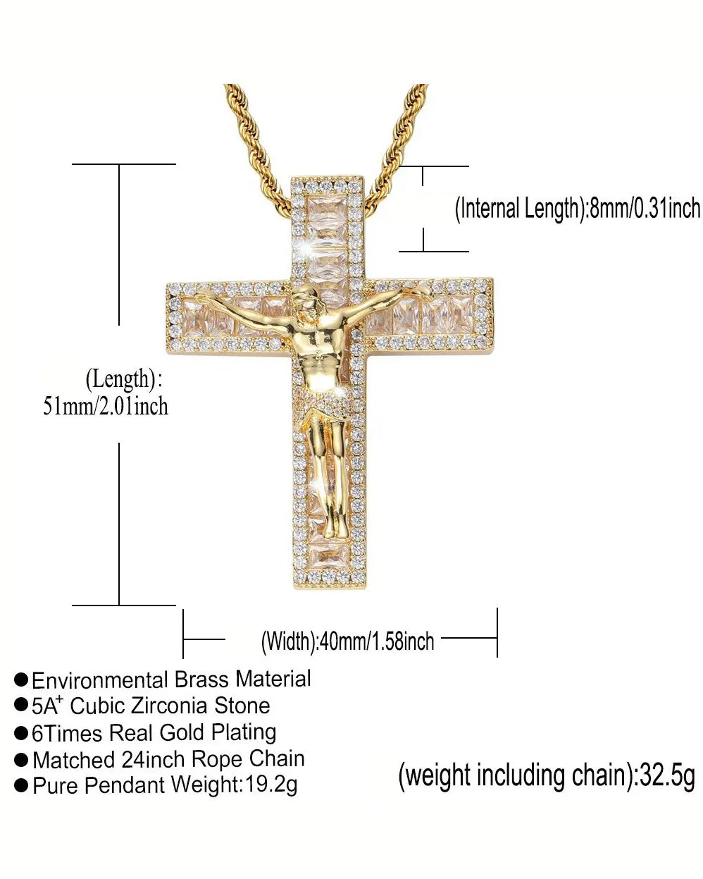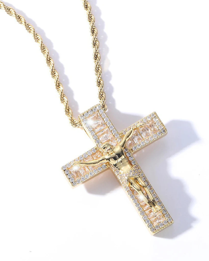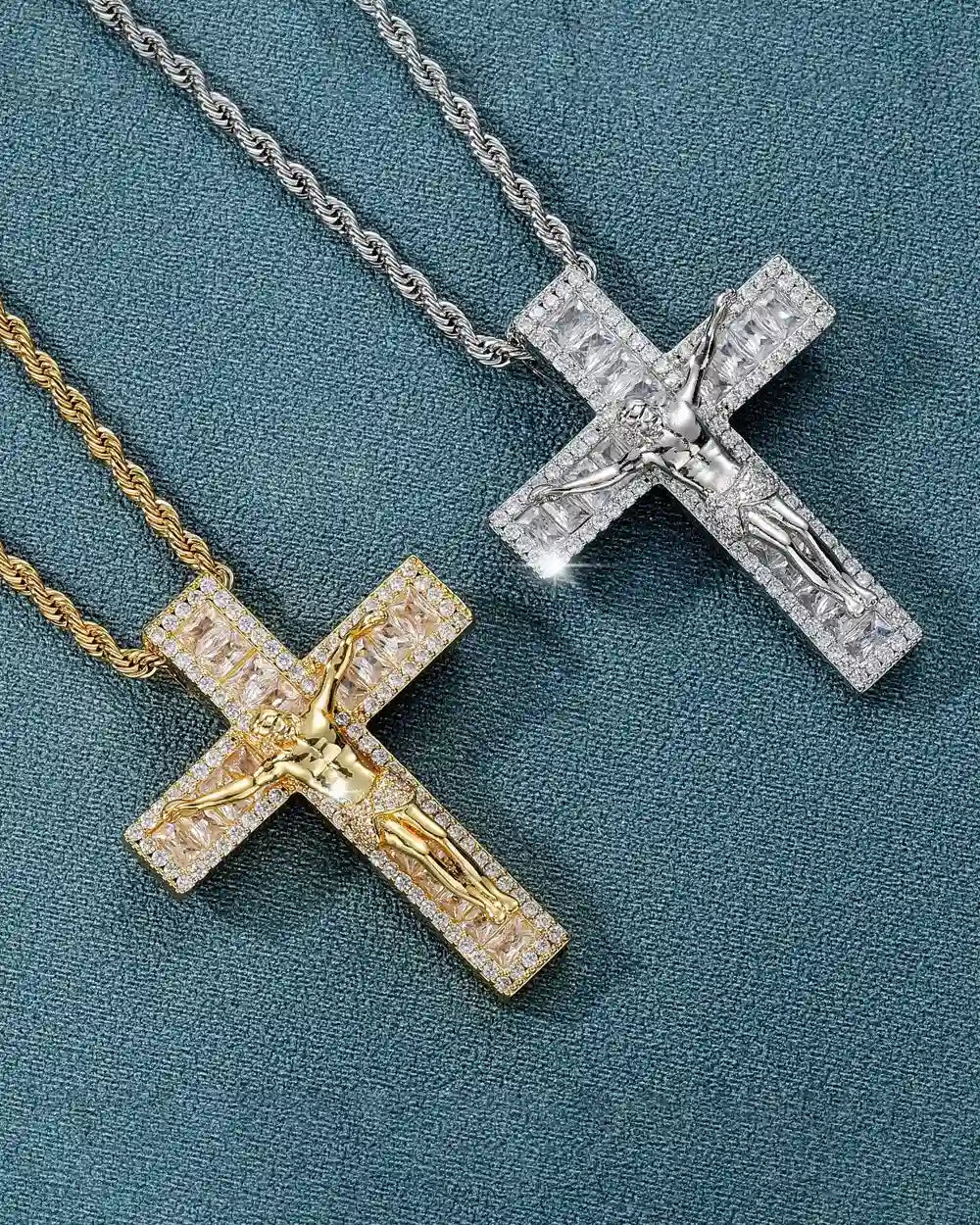 A radiant gold cross encrusted with dazzling stones, featuring a sculpted Jesus at its center. A bold fusion of faith, power, and timeless luxury.