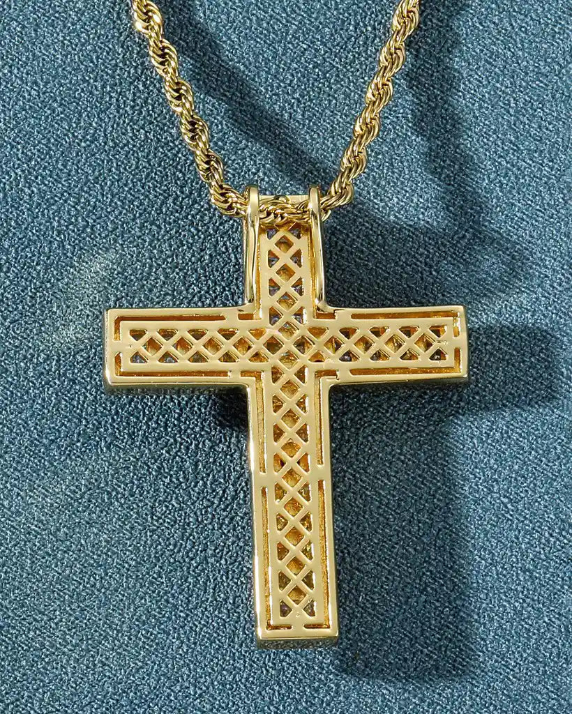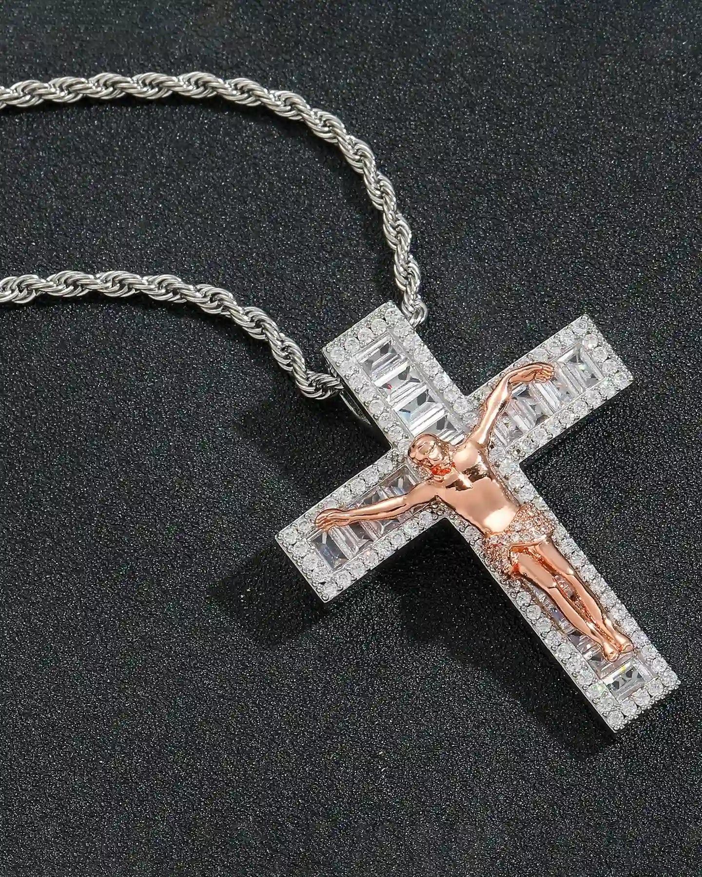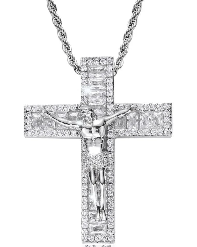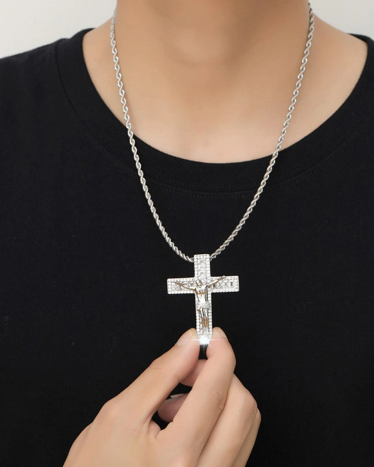 A radiant gold cross encrusted with dazzling stones, featuring a sculpted Jesus at its center. A bold fusion of faith, power, and timeless luxury.