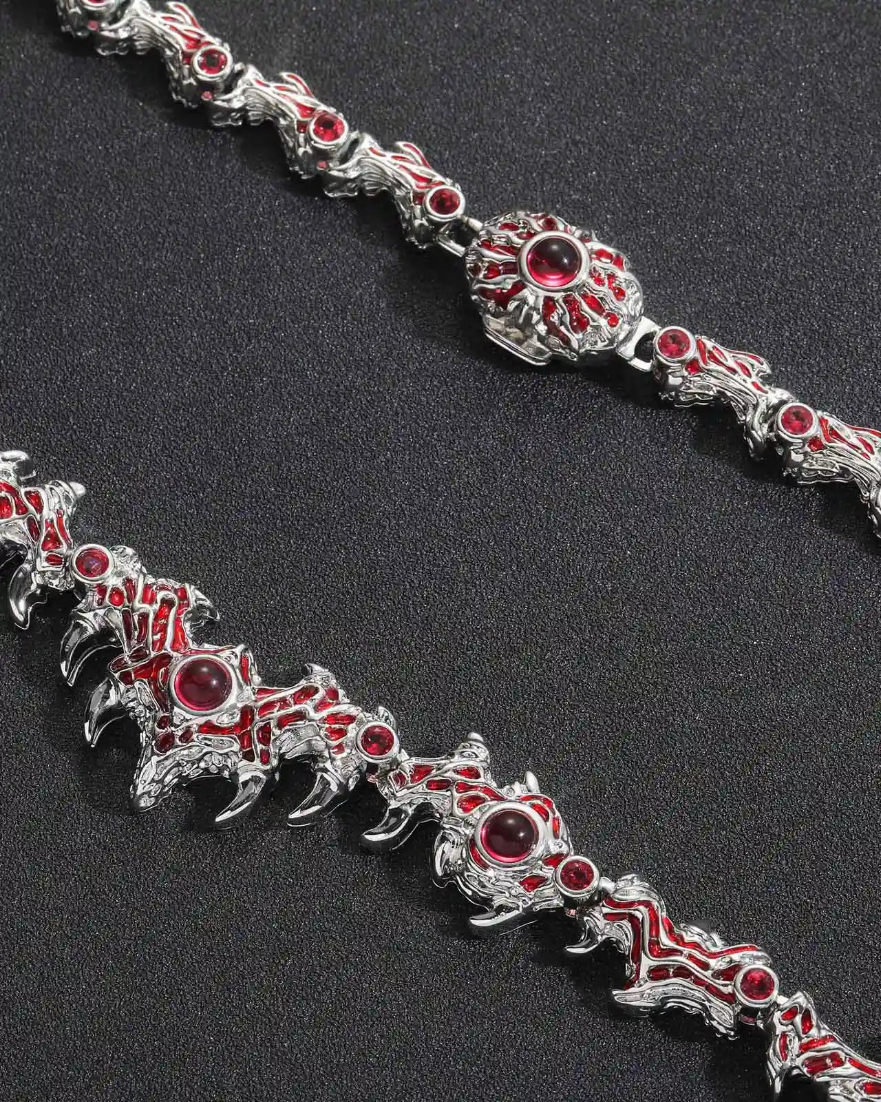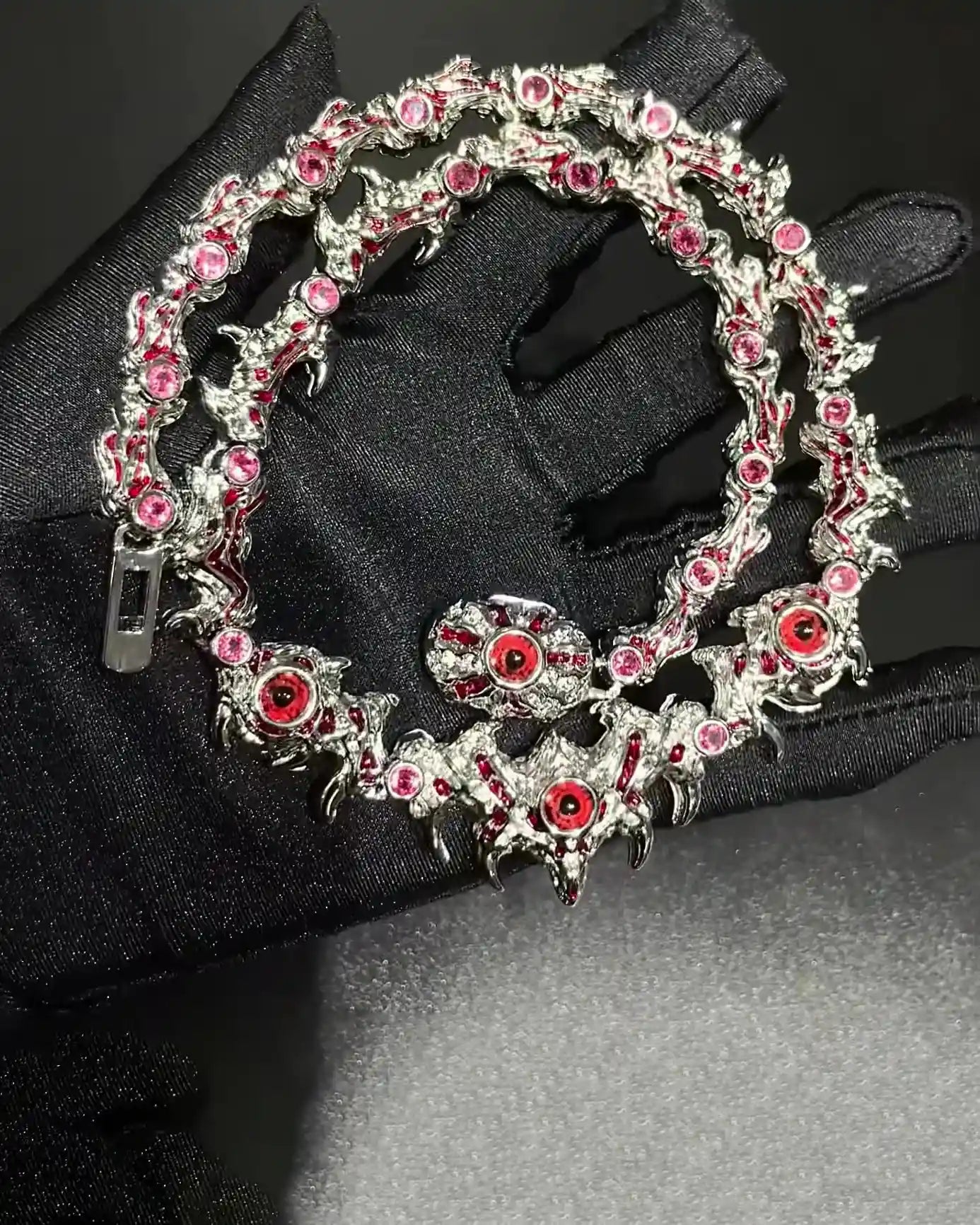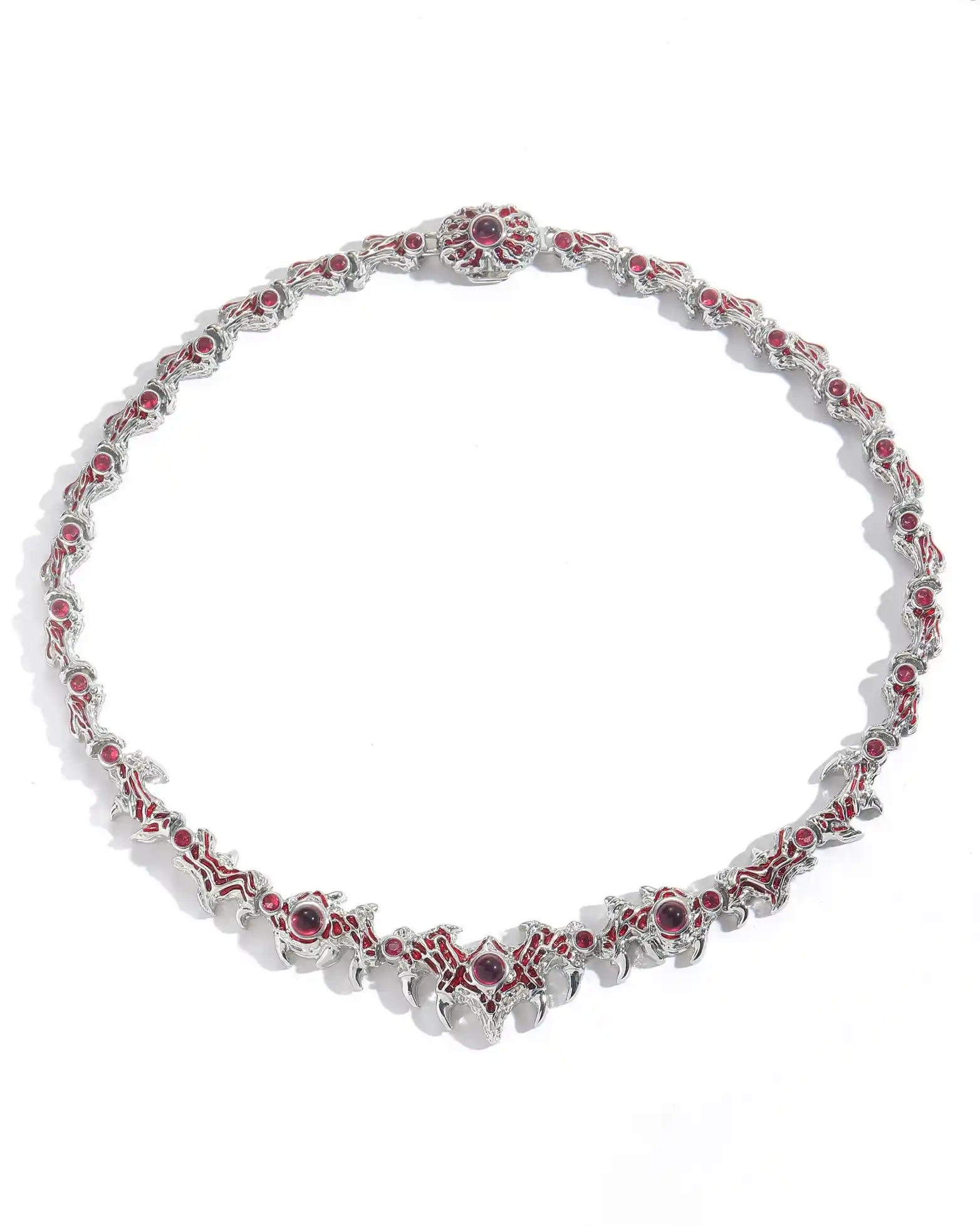 "Entwined with thorns, each crimson gem resembles a watchful eye. A fusion of silver thorns and blazing stones — mysterious, fierce, and unbound."