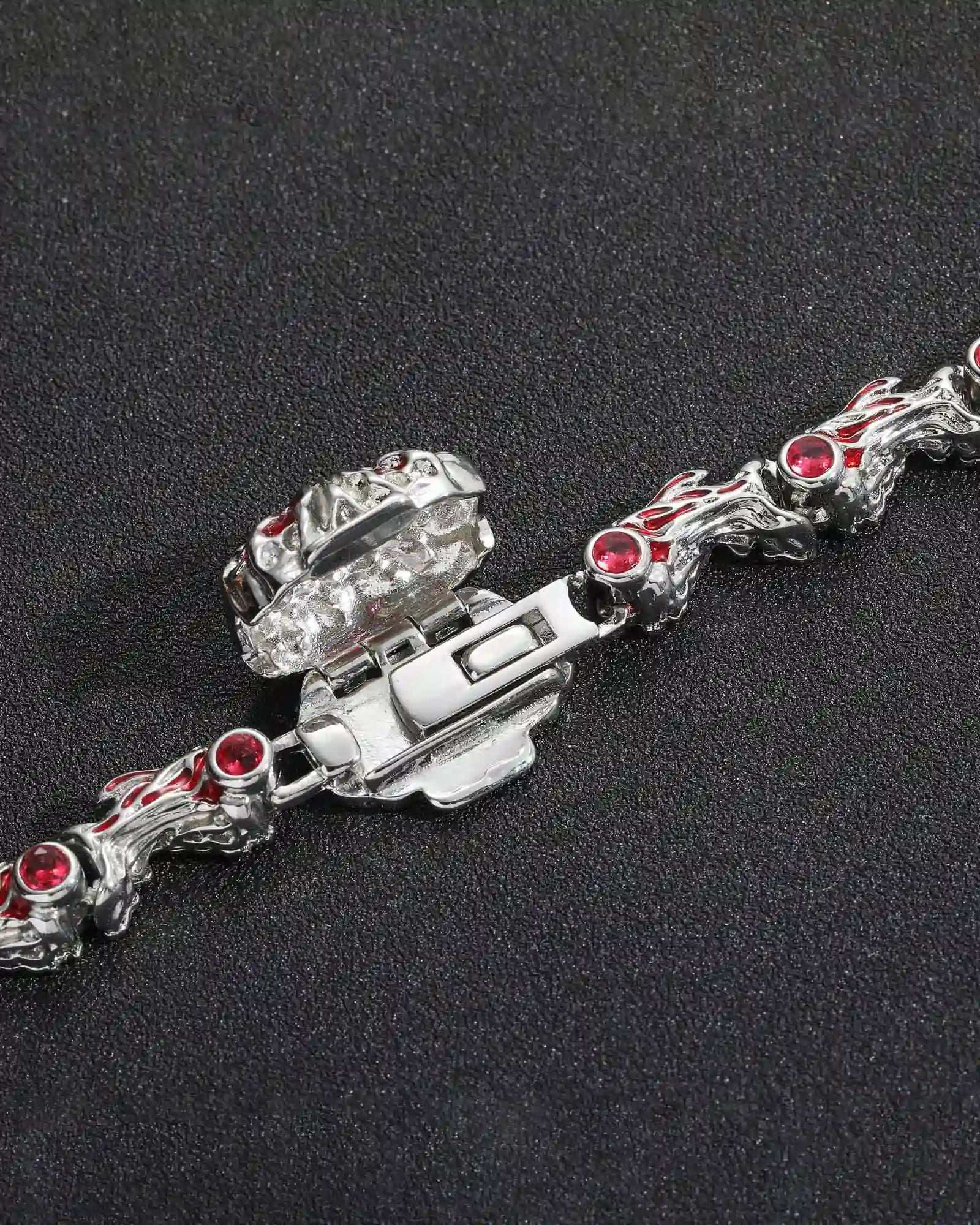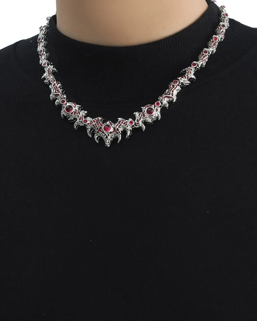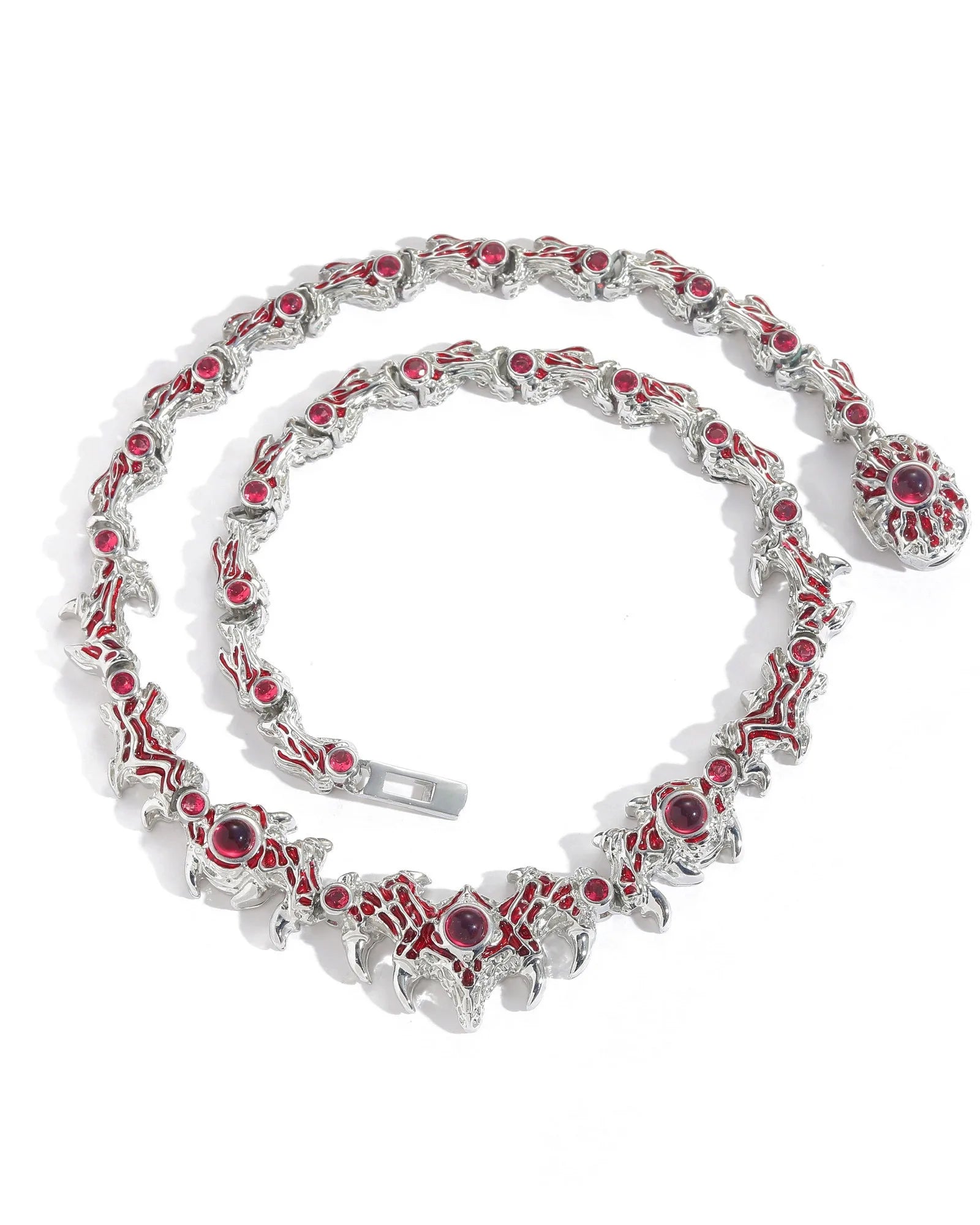 "Entwined with thorns, each crimson gem resembles a watchful eye. A fusion of silver thorns and blazing stones — mysterious, fierce, and unbound."