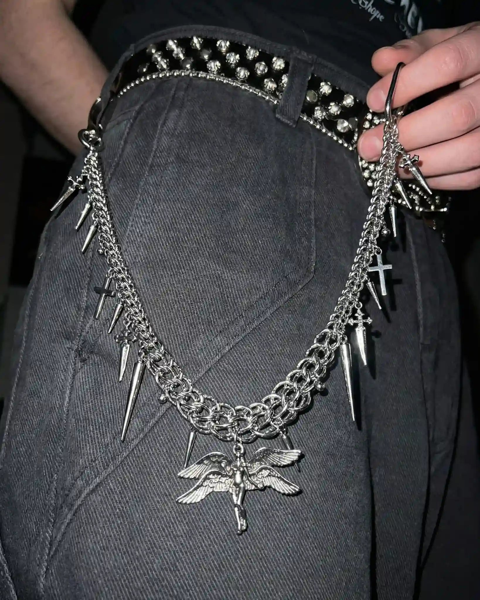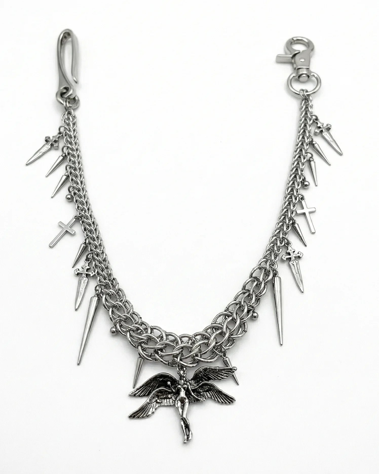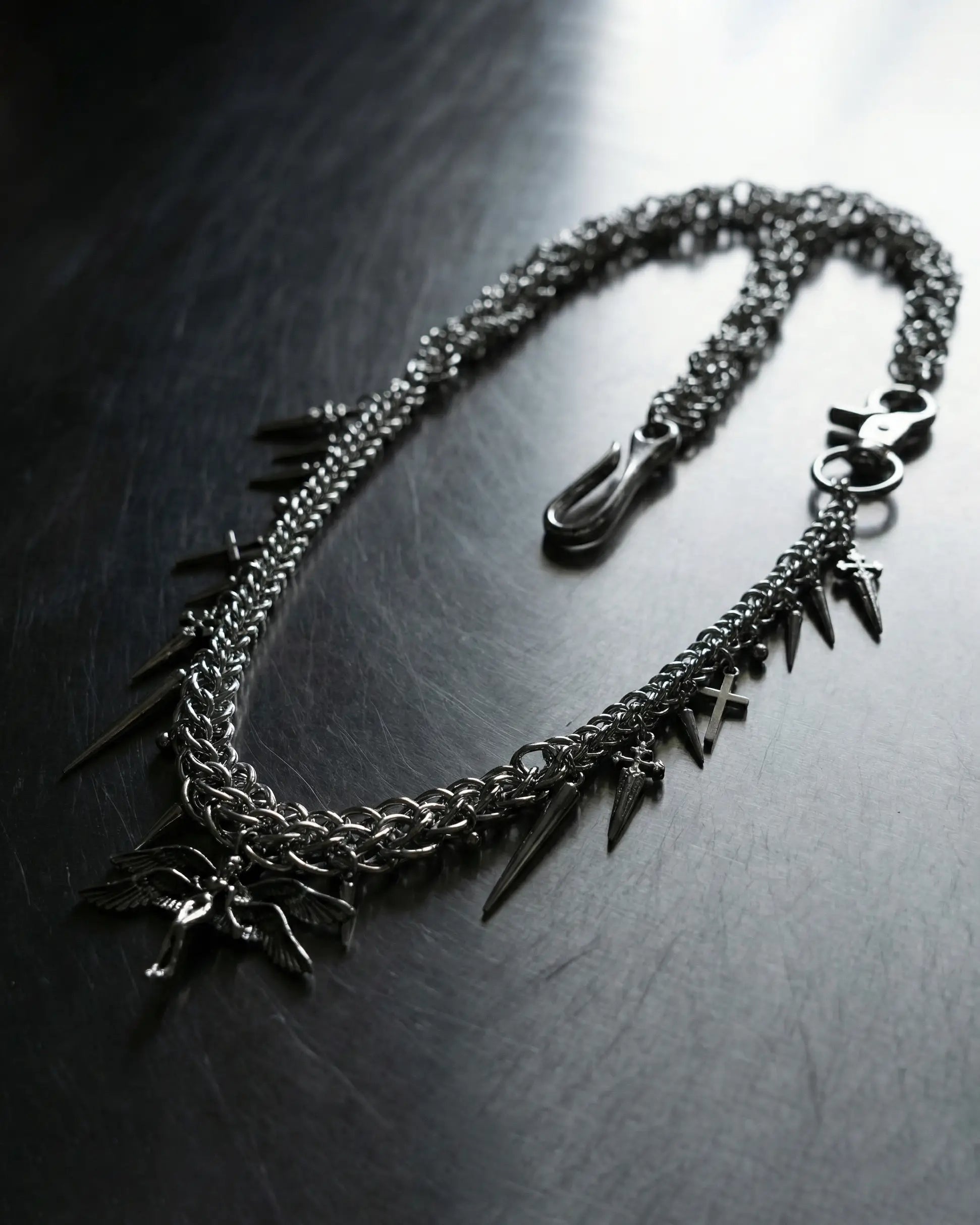 • A chainmail-woven body loaded with dagger spikes,scattered crosses, and a fallen angel centerpiece  that hangs like a trophy.
