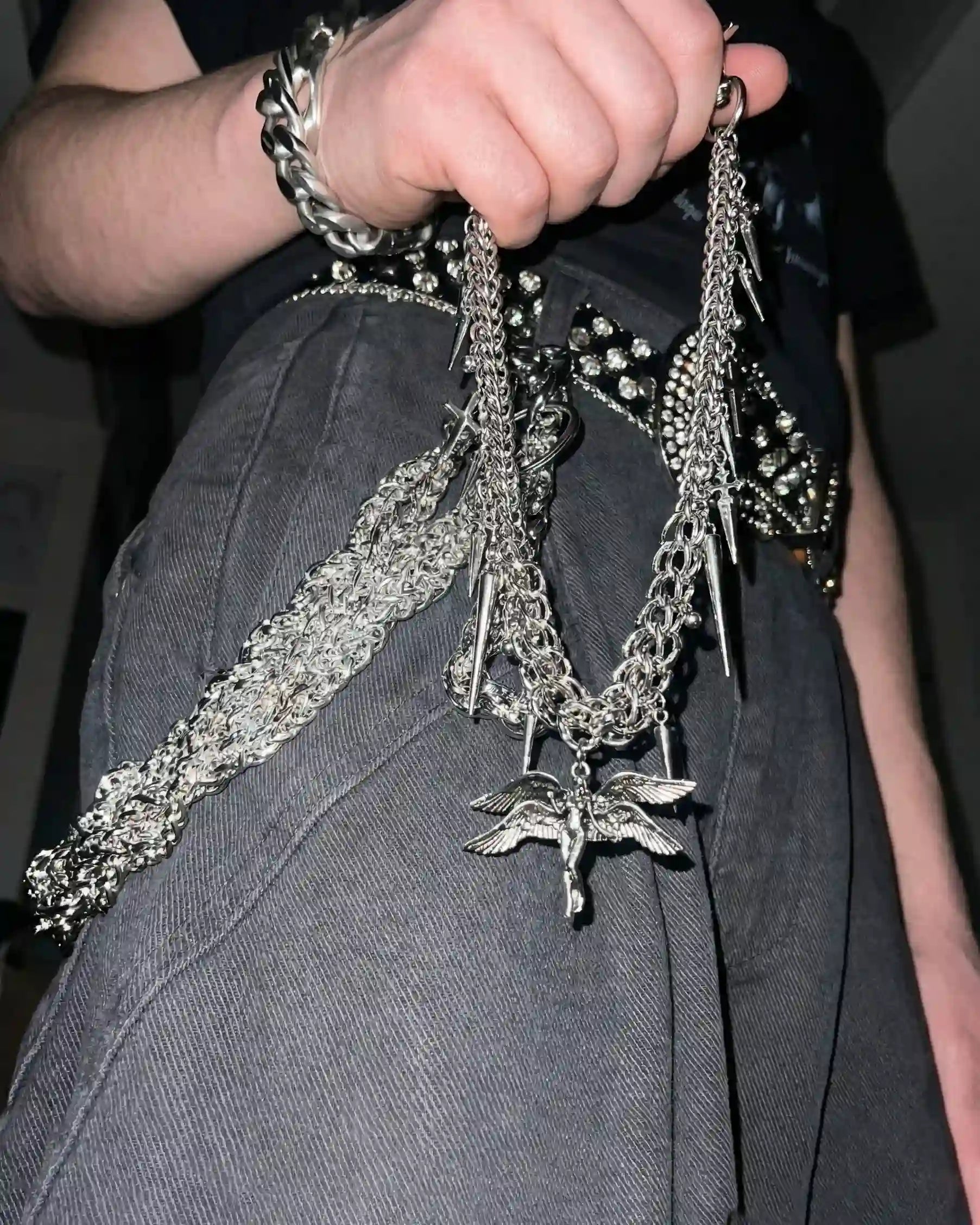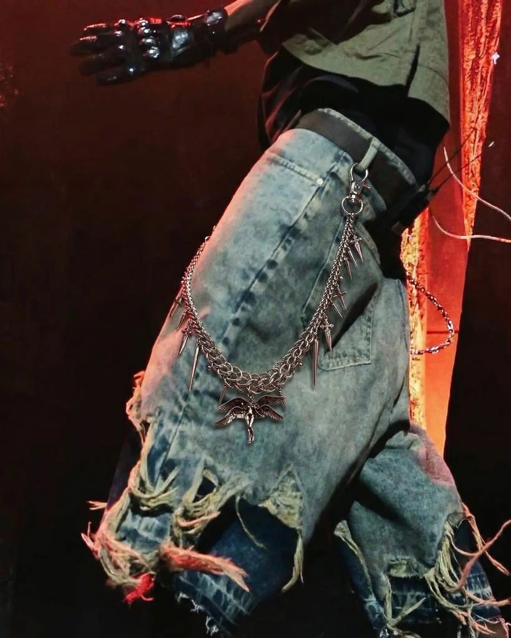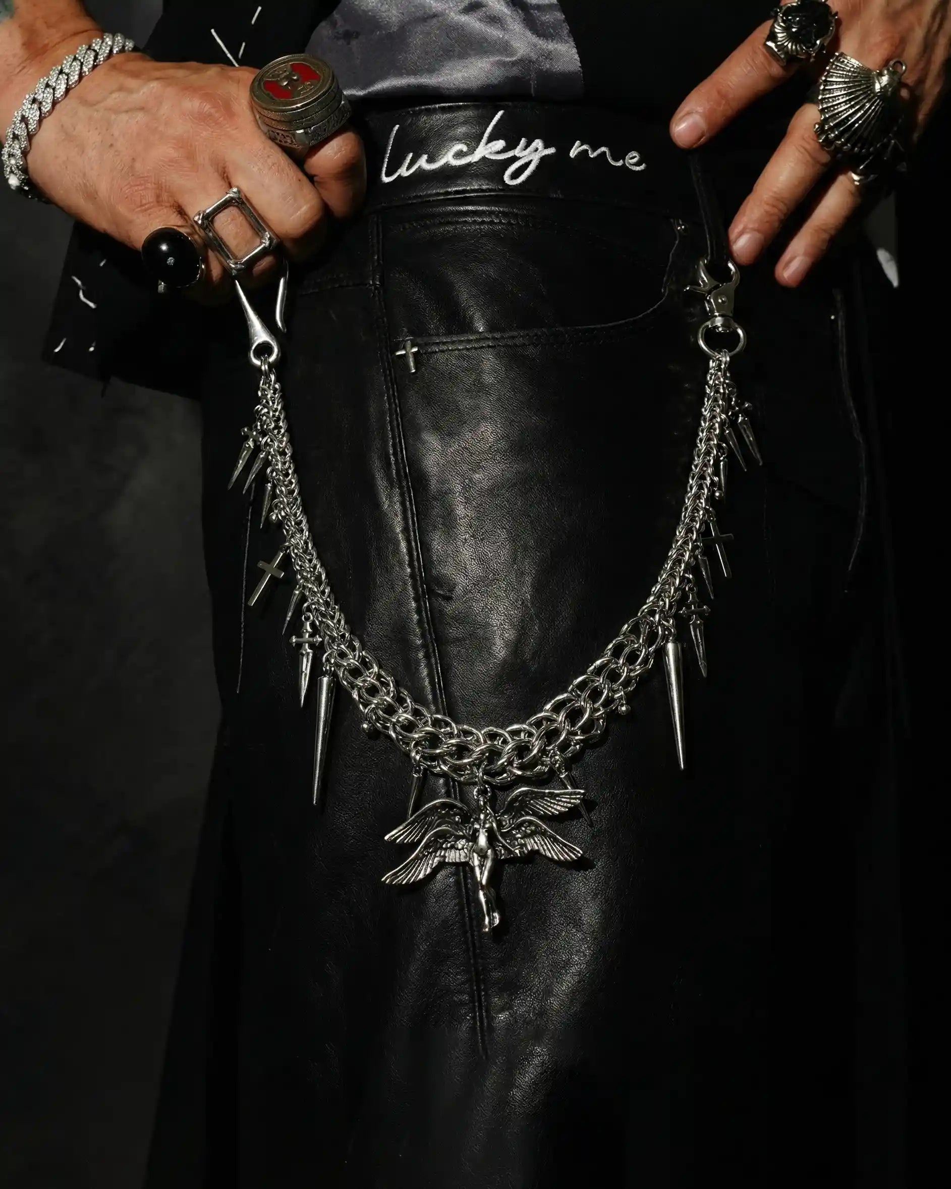 • A chainmail-woven body loaded with dagger spikes,scattered crosses, and a fallen angel centerpiece  that hangs like a trophy.