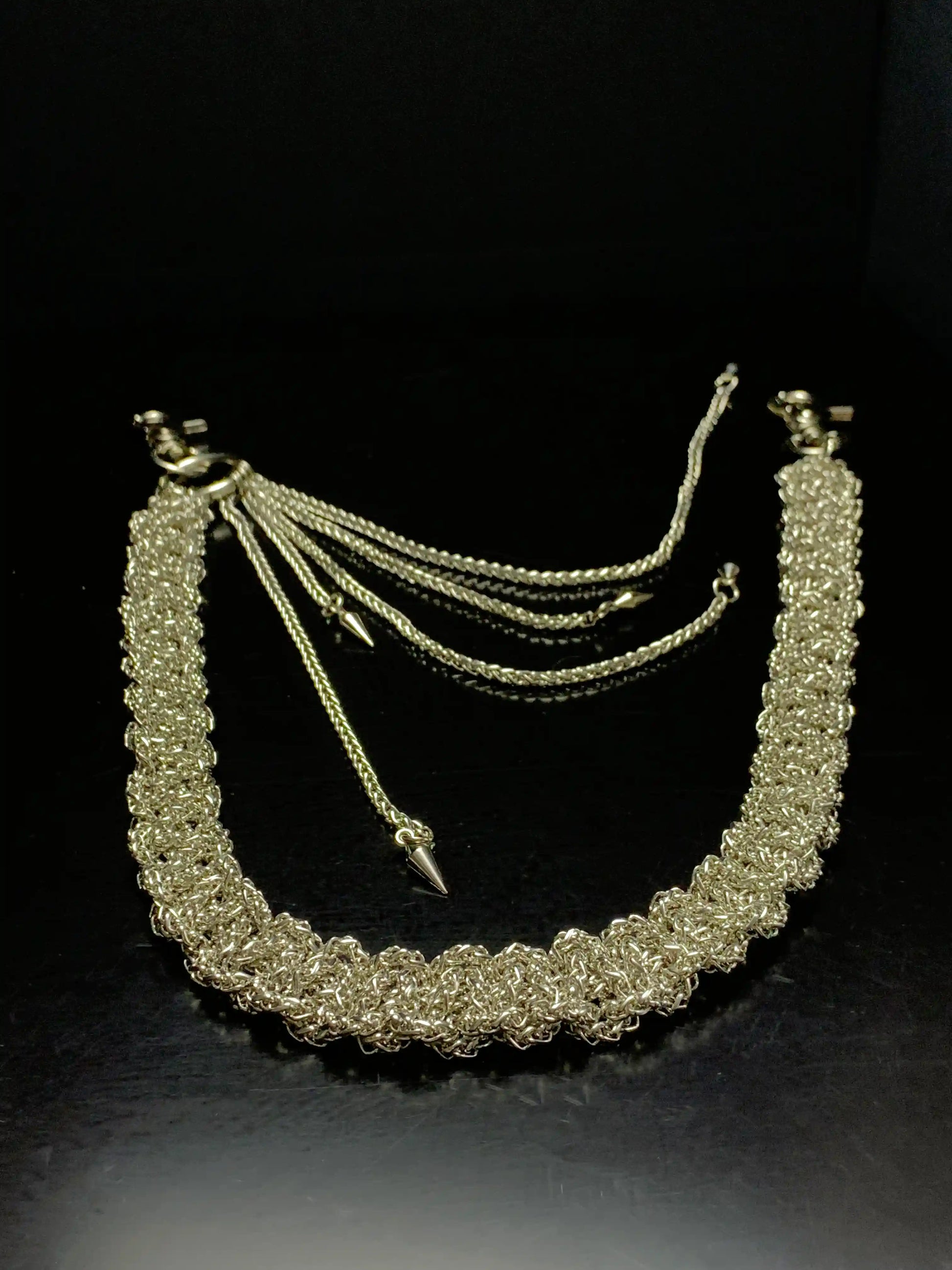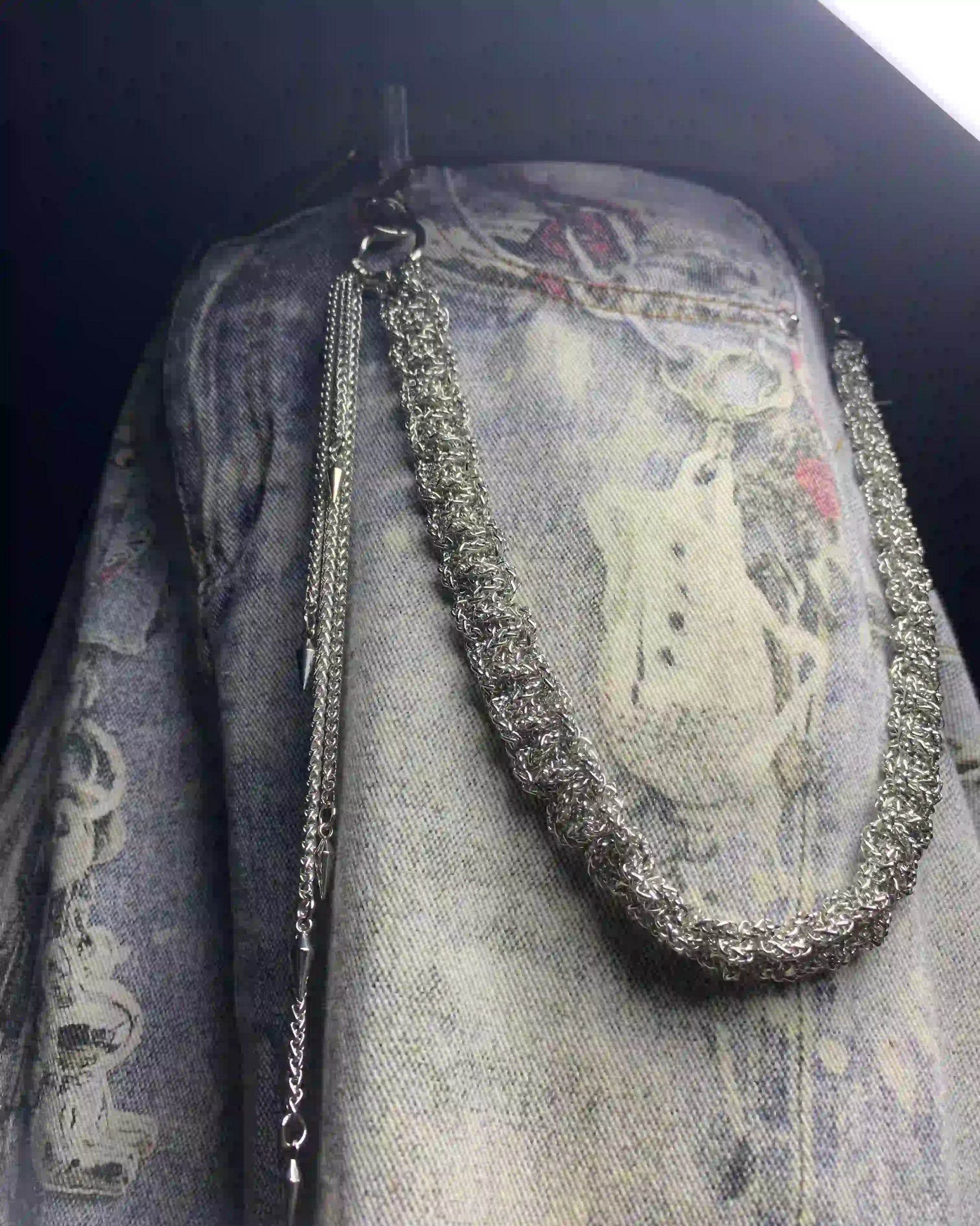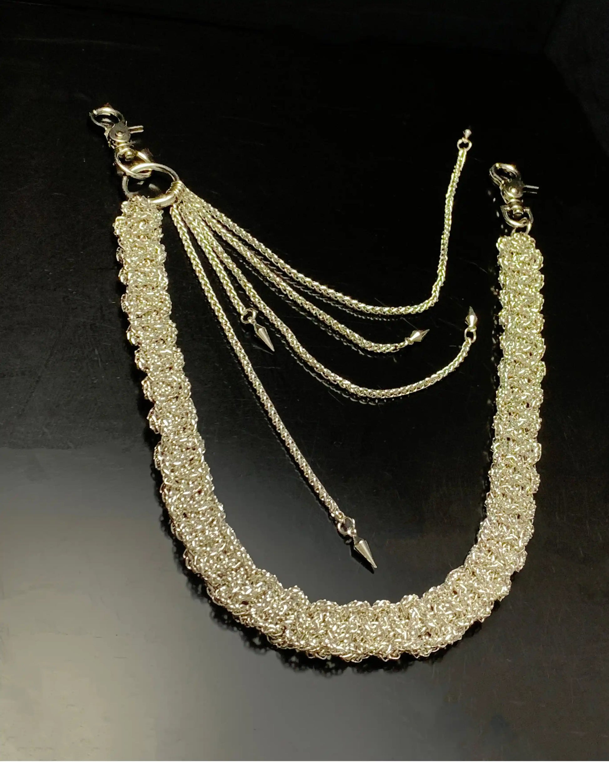 “Woven turns wild. No words. No light. Just braided metal hugs, tassel drips, and that raw night‑crawler pulse.