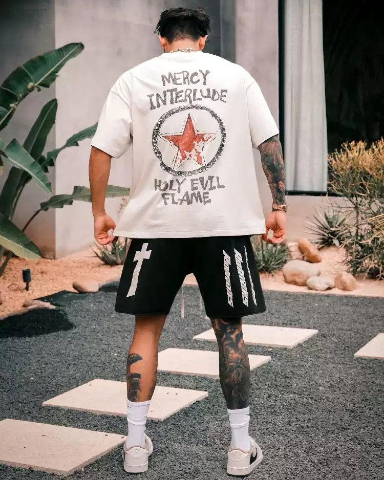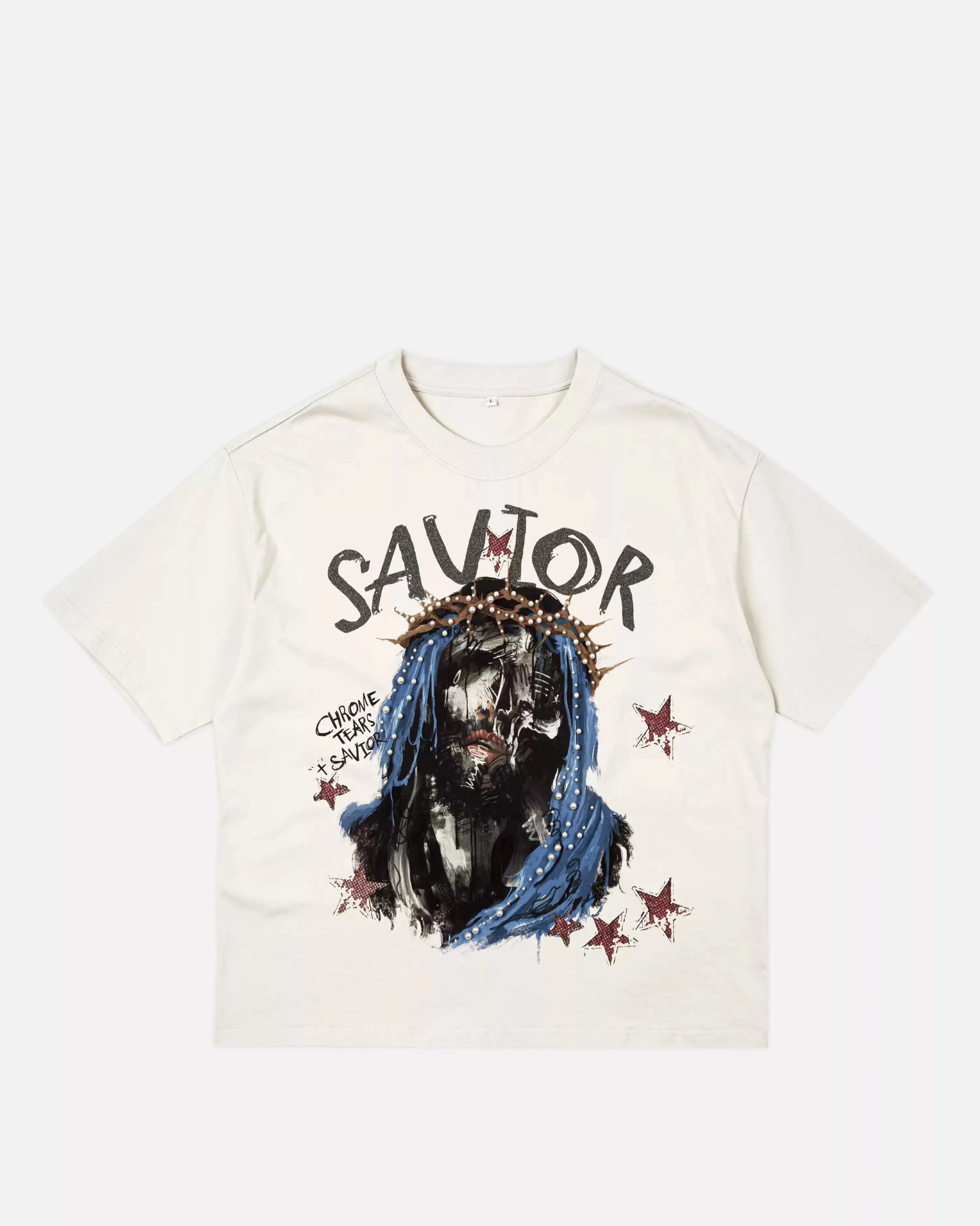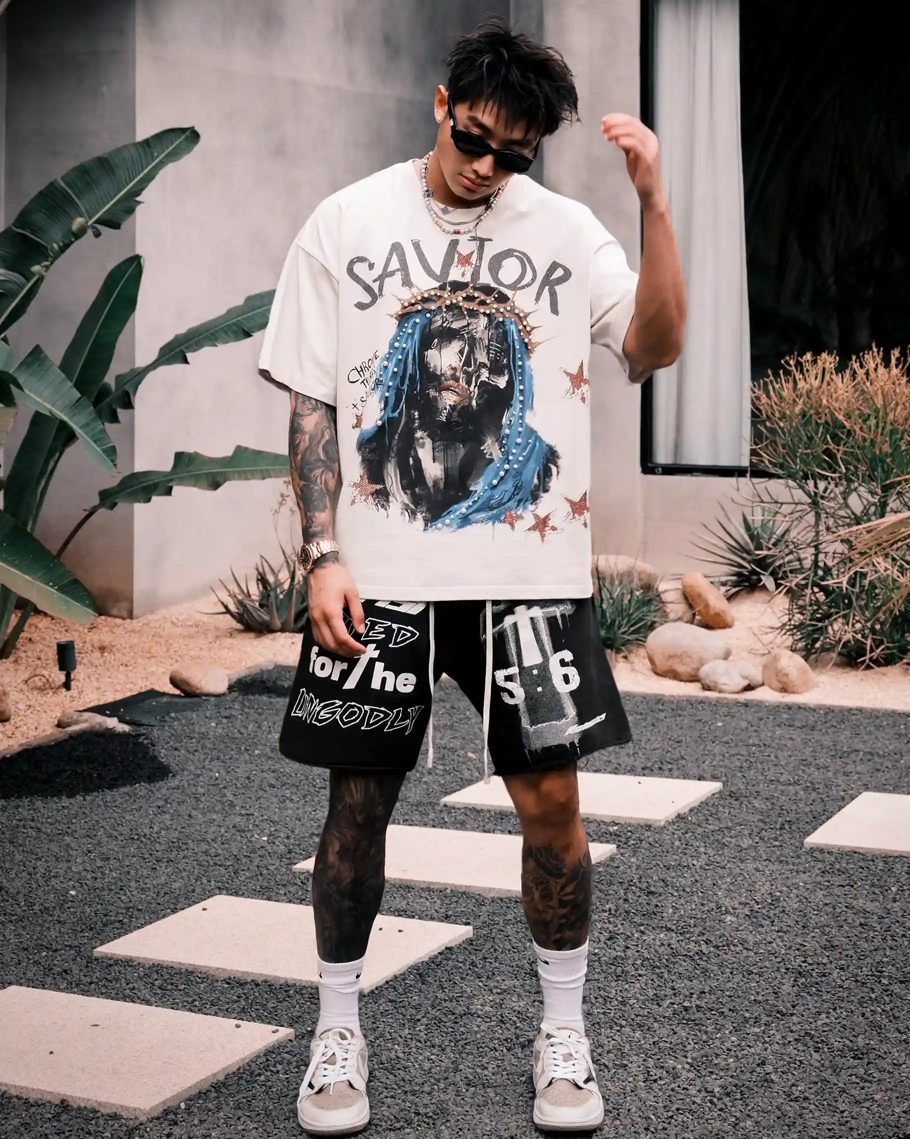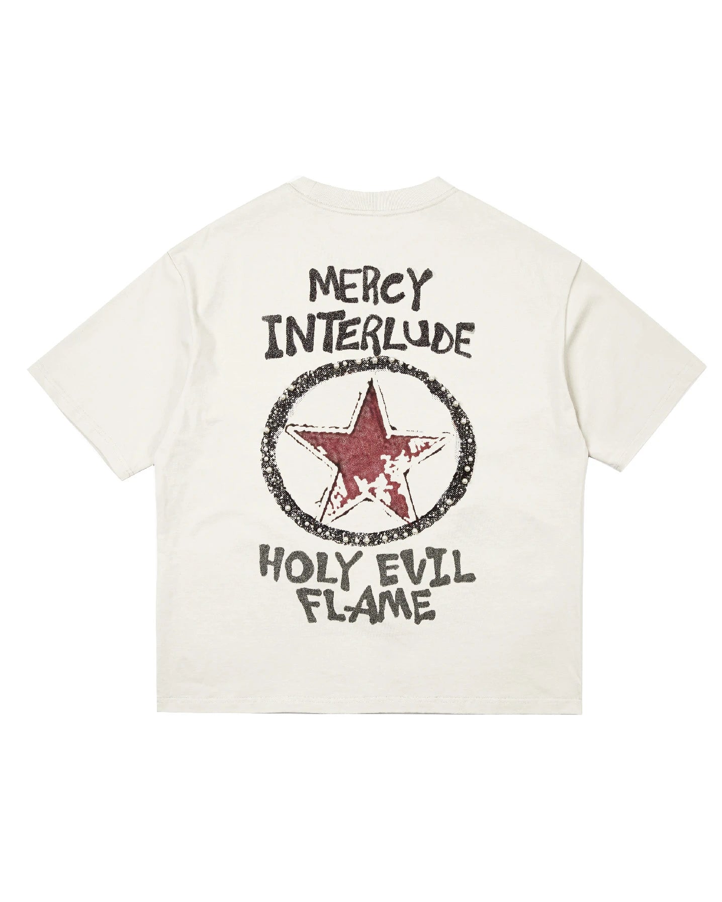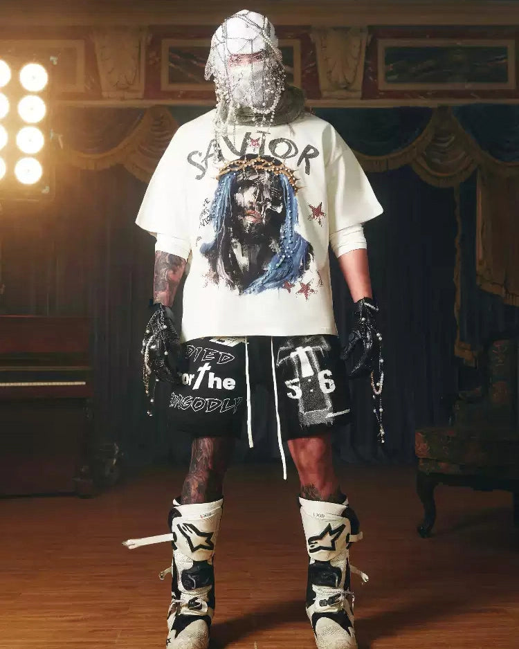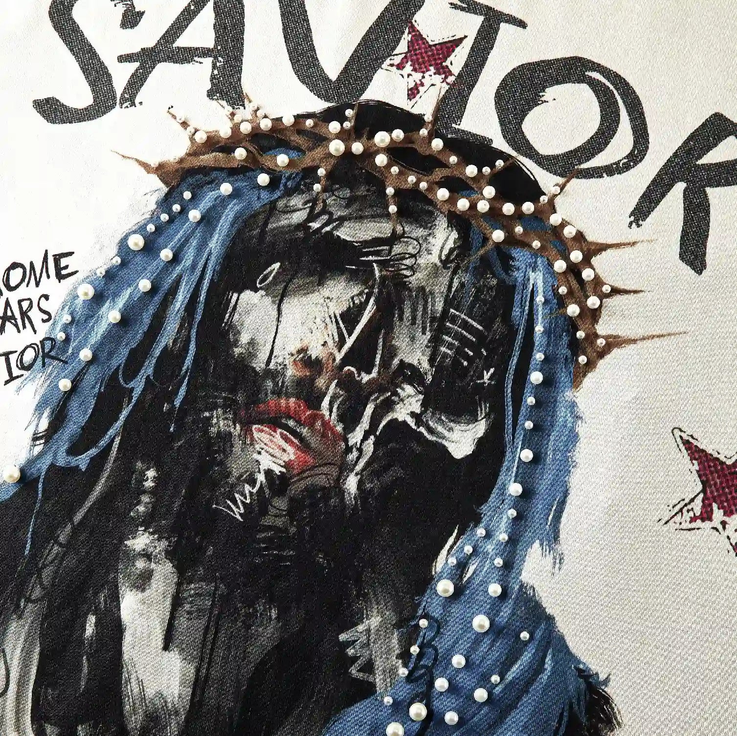 Pearls bleed into ink, threading a silent narrative of sanctity and rebellion. Hand-painted strokes sketch visions caught between redemption and damnation, while dimensional pearls punctuate the fabric like celestial whispers in chaos. Wearable art becomes ritualistic, a sacred profanity frozen between mercy and menace. This isn't fashion; it's your quiet anthem, an interlude of holy evil, softly burning in pearl and pigment.