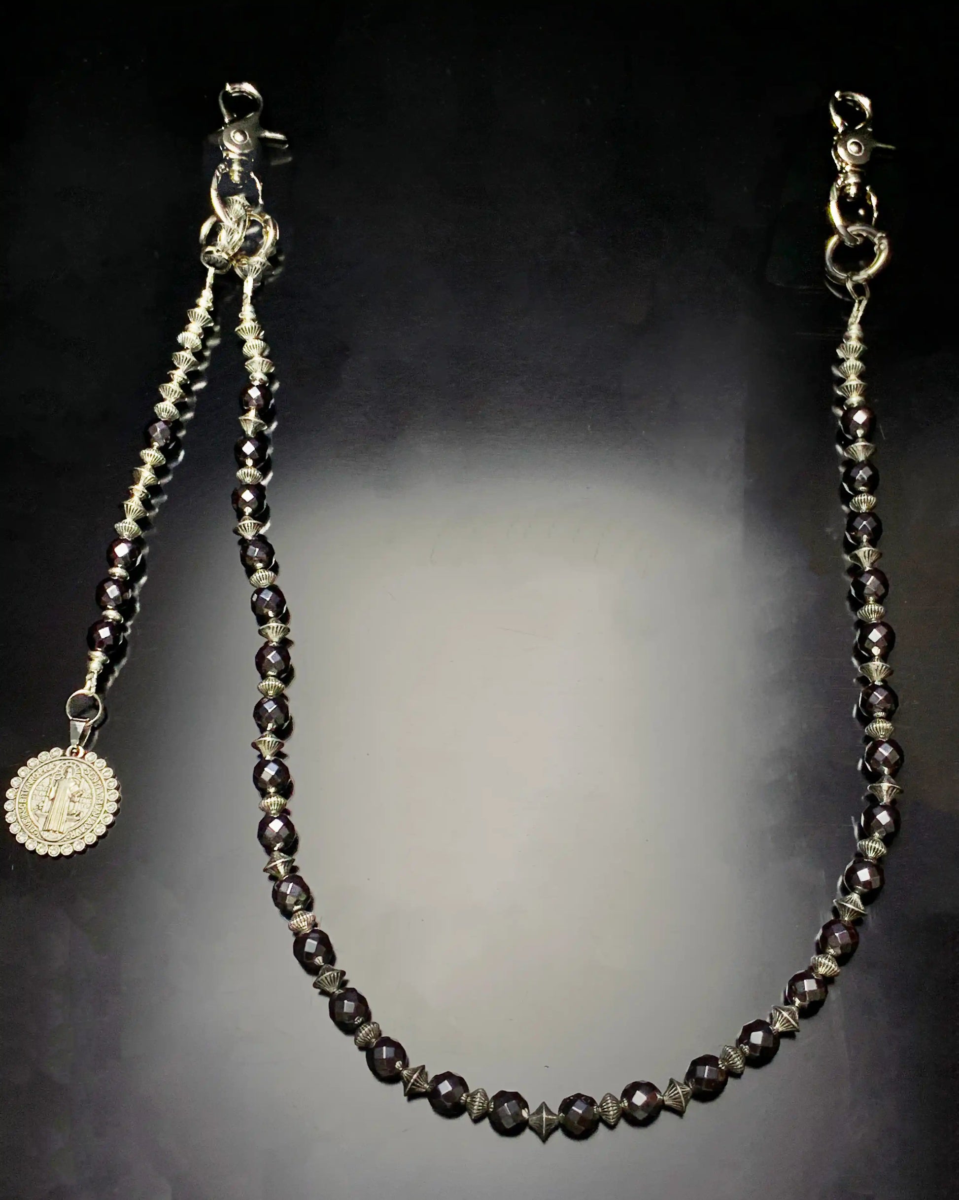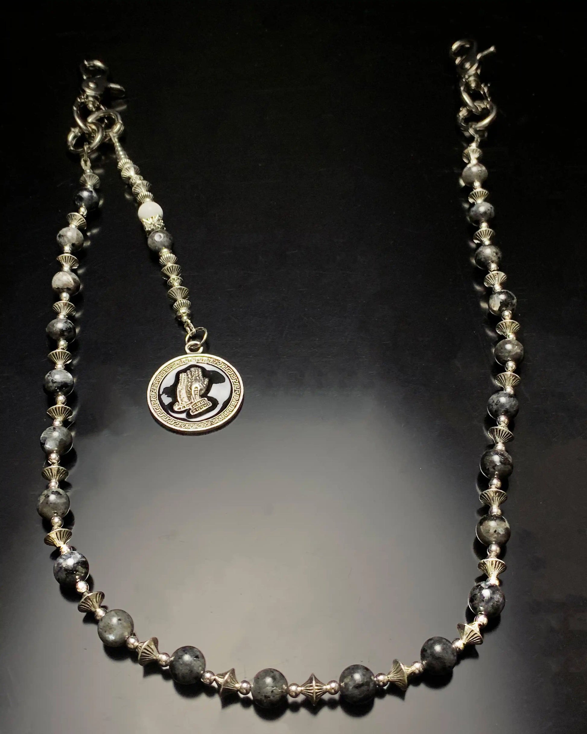 A soul forged from black‑gray artisan beads and titanium steel, this chain drops gritty geometry into your look. A badge charm etched with praying hands lands like a verse in the flow. Double clasps flex—belt, bag, whatever moves your vibe.