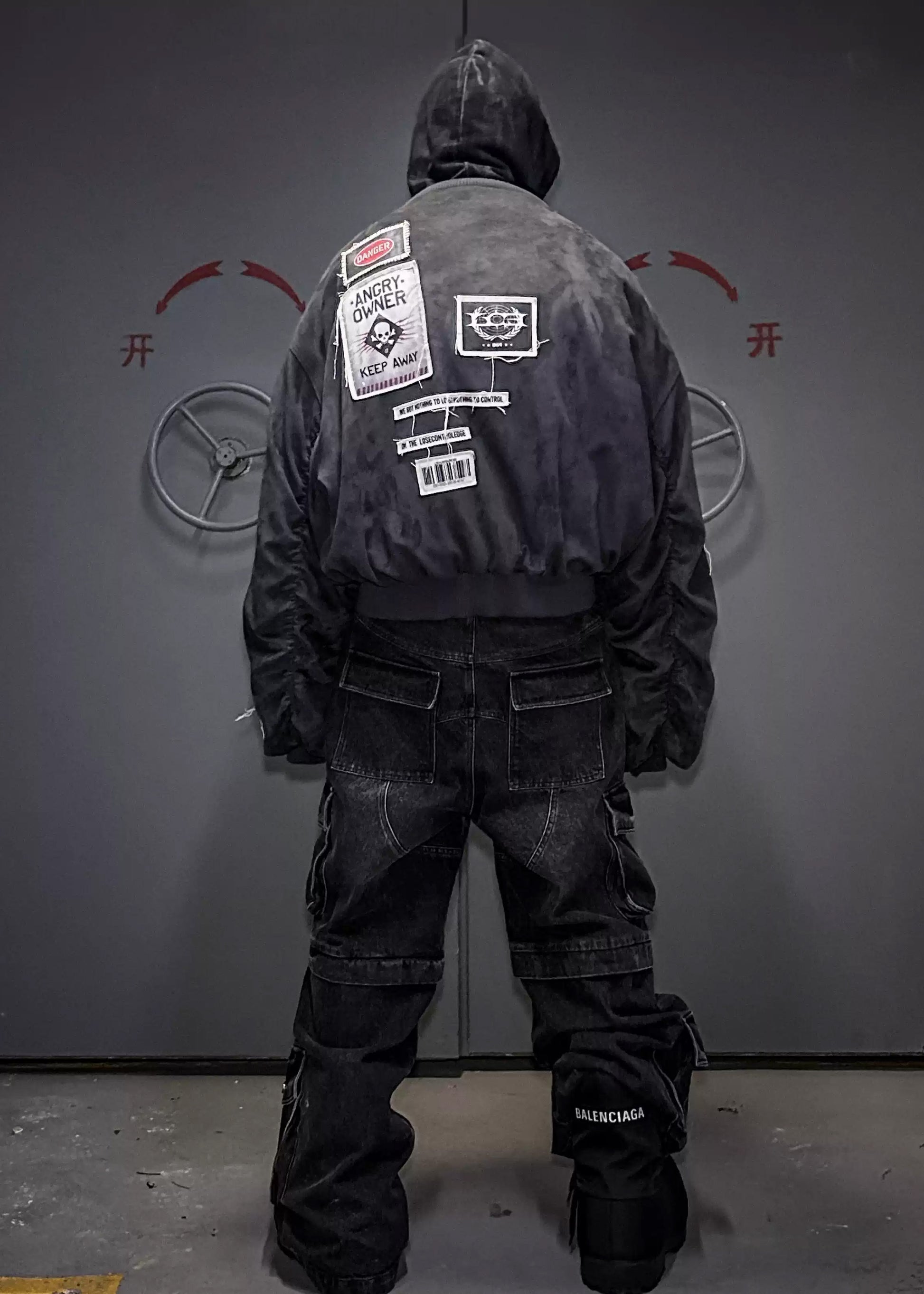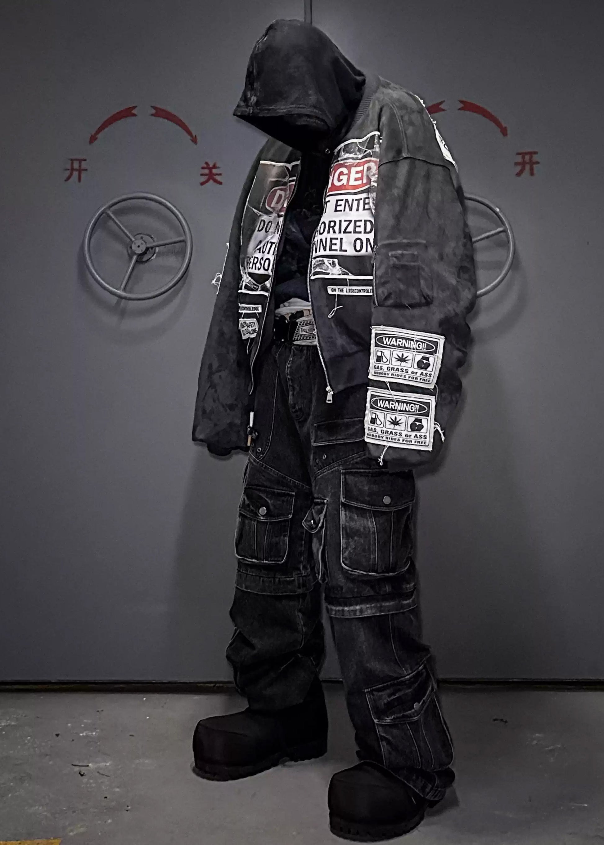 This cropped oversized jacket redefines streetwear with a raw, uncompromising edge. Featuring canvas patchwork details with raw-cut, unfinished edges, it embraces imperfection as a form of rebellion. The warning label graphics inject an industrial, cautionary vibe—reminding everyone that boundaries are meant to be pushed, not obeyed.